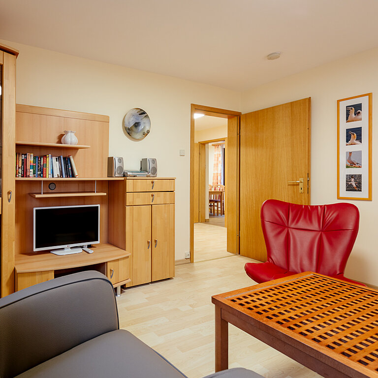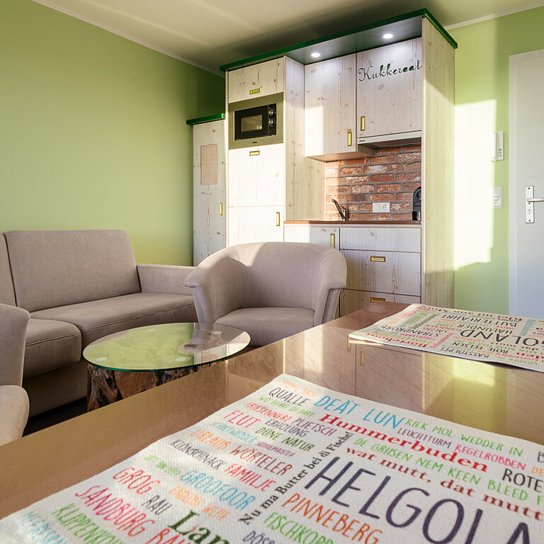 Vom gemütlichen Wohnzimmer blicken Sie auf die Düne und Helgoland Reede. Das Schlafzimmer liegt zur ruhigen Gartenseite. Die Ferienwohnung verfügt über eine Küche, einen Flat-TV und kostenloses W-LAN.