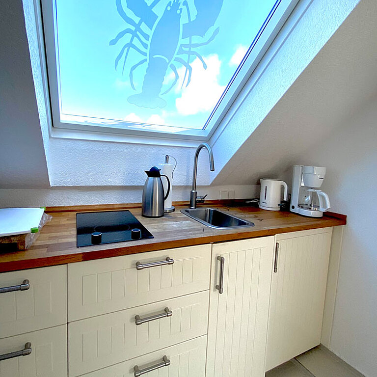 - Küche mit Spülmaschine, Kaffeemaschine und Wasserkocher