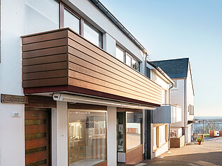 Gleich am Eingang des Oberlandes, fünfzig bzw. dreißig Meter vom Lift oder der Treppe entfernt, liegt das "Haus Germania", an der Straße Steanaker - der Hauptweg des Oberlandes. Von hier gehen Sie nur dreißig Meter bis zum Klippenrand und genießen den herrlichen Ausblick über die Düne, das Unterland und bis in die Elbmündung.