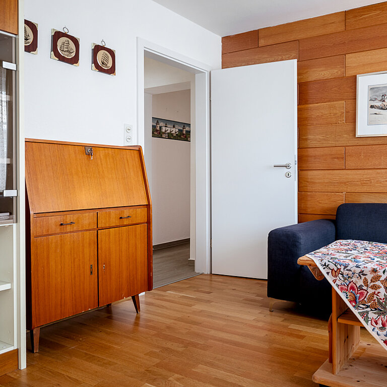 Die Ferienwohnung Sellebrunn befindet sich im Erdgeschoß im Haus Frier und ist zur Inselseite gelegen. Die Wohnung hat eine kleine Küchenzeile und ist unterteilt in einen Wohn/Essbereich und ein Schlafzimmer.